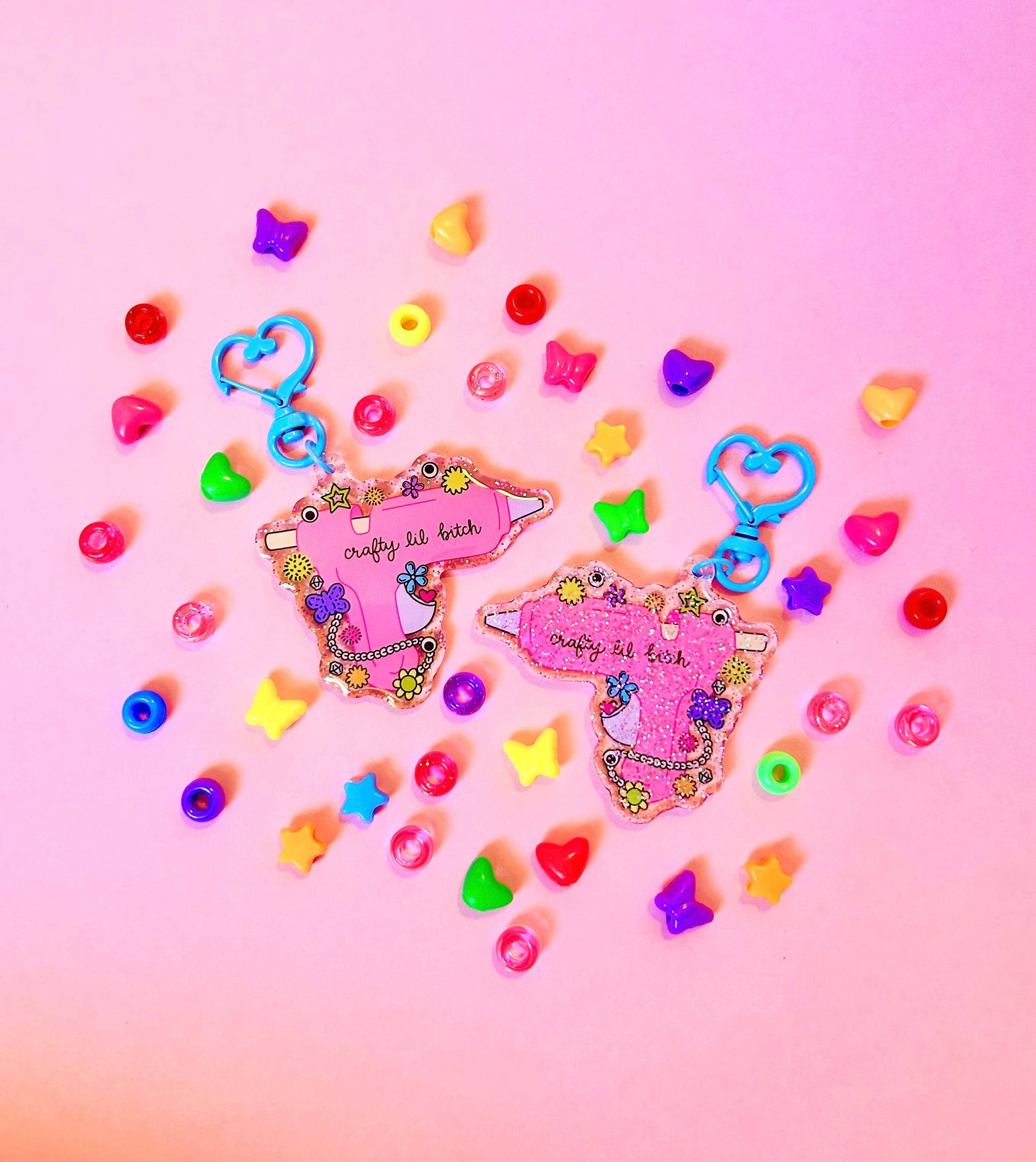 This keychain is made of clear glitter acrylic and is double sided. Baby blue heart-shaped lobster clasp perfect for attaching to your keys or your bag for an extra bit of joy.